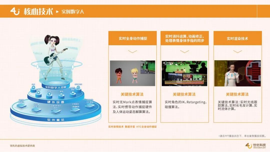 技术领先性一直是世优科技的核心竞争力,在动作捕捉、表情捕捉、手势捕捉在内的多模态动作驱动的底层技术等方面,世优科技拥有40多项计算机软著,20多项国家发明专利。其中,全身动捕服(传感器精度0.2度)、表情头盔(拍摄速度60帧/秒)、数据手套等硬件设备均为公司自研品牌,支持全身实时同步高精度捕捉、实时数据精修、实时高品质渲染,可为客户提供全栈式数字人解决方案。