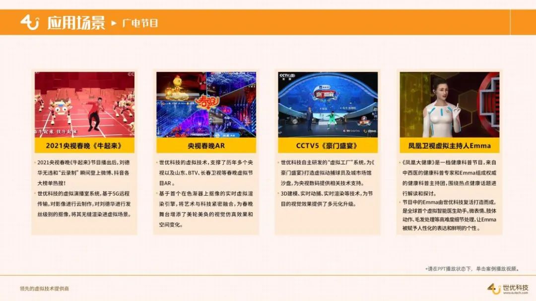 从2014年《星光大道》舞动的迈克尔·杰克逊到2016年《欧洲杯·豪门盛宴》侃侃而谈的各大“球星”,从2012年《80后脱口秀》与王自健互怼的趣多多到2016年《食在囧途》和徐峥共游的苏宁小狮子……世优科技是全球最早实现实时数字人技术并进行商业化落地的团队。