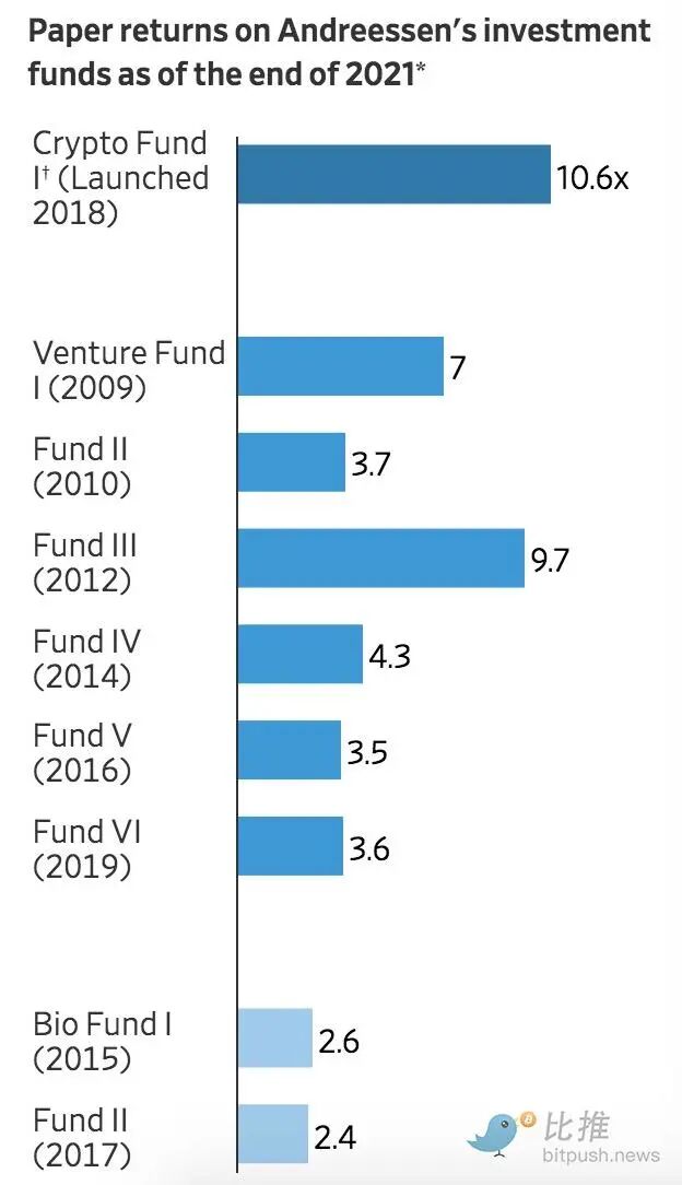 《华尔街日报》获取的一份文件显示,截至去年底,第一只加密基金扣除费用后的初始投资翻了 10.6 倍,成为a16z 历史上表现最好的基金。