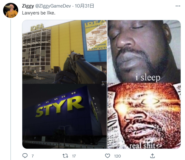 10月31日,雅各布在推特上传了一张梗图,控诉这种不公。他讽刺宜家的律师对自己的“STYR”家具城重拳出击,却对另一部FPS《逃离塔科夫》中以宜家为原型设计的“IDEA”商城视而不见。