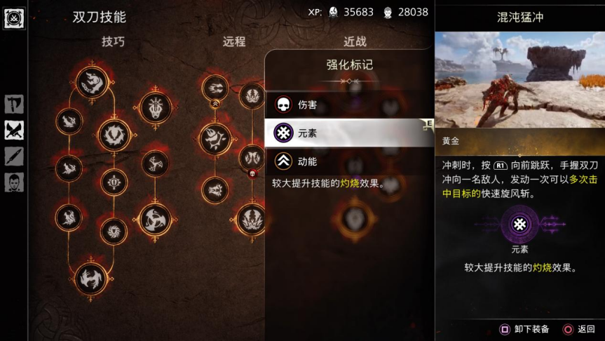 这次除了有更多可触发元素伤害的技能外,玩家在使用不同的技能招式时,系统也会记录玩家使用该招式的次数,当次数达到要求的“黄金”等级后,该技能就会解锁一个额外的技能插槽。玩家可以在伤害、保护、动能、元素、眩晕等多个词条中,随意选择一个并装备到该技能上,从而提升技能释放所带来的额外效果。