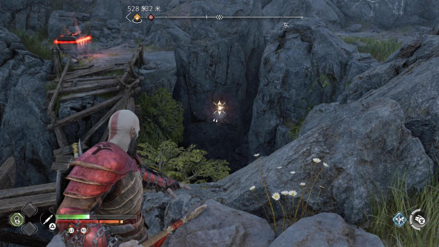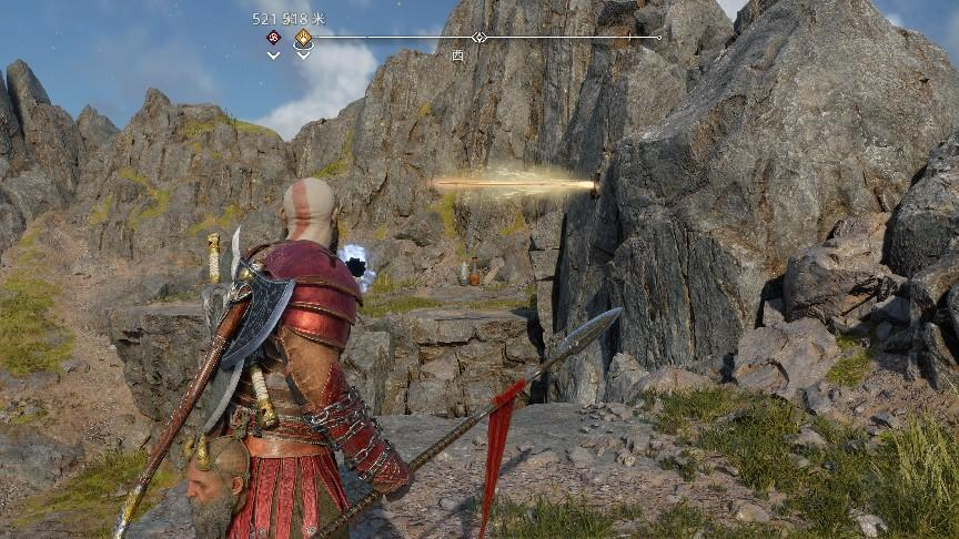 此外,玩家在完成地图解谜时,也会频繁运用到这把新武器。比如,当看到附近的石壁上存在裂纹时,投掷长矛并引爆,就可以震碎这些石壁,开辟出一条隐藏的道路。当石壁上设有特定的投掷点时,掷出的长矛又可以充当支点,帮助奎爷到达一些此前无法靠跳跃到达的平台。