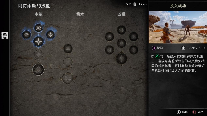 阿特柔斯这次也有了独立的装备和技能树页面。玩家可以消耗经验,学习阿特柔斯专属的近战、远程技能,也可以随时更换弓的种类和弓上的符文技能。等到流程后期解锁全部技能后,即便是从阿特柔斯身上,玩家也能看到“战神”系列一脉相承的爽快打击感,以及华丽的连招演出。