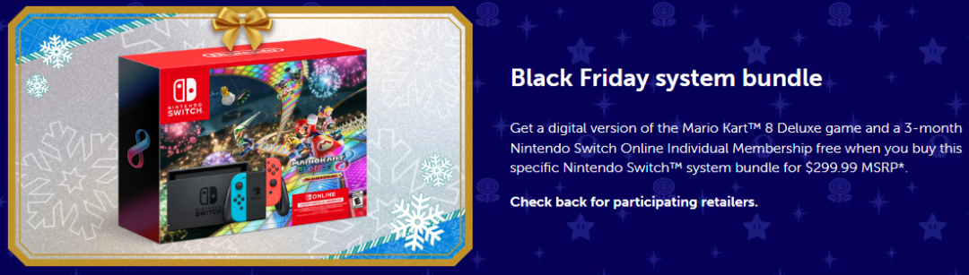美任公布今年的黑五促销优惠套装,NS续航版+《马力欧卡丁车8 豪华版》售价299.99美元,附赠3个月Nintendo Switch Online个人会员,11月20日开售。