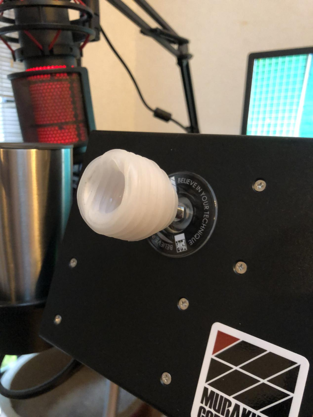 这款功能类似于街机摇杆的独特外设,是畠山骏也自创的“下巴控制器”。它和其他摇杆最大的不同,就是将传统的顶部塑料球形握把,替换成了一个向内凹陷的缓冲胶垫,用来方便他使用下巴控制摇杆进行游戏操作。而它的材料,则来自日本飞机杯大厂——TENGA旗下的一款名为“POCKET TENGA”的便携式飞机杯。