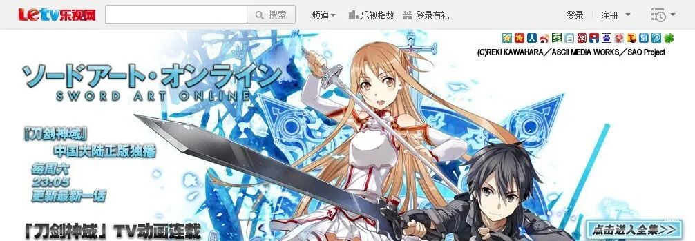 此时正是国内“新番正版化”的元年,买下《刀剑神域》版权的乐视不遗余力地对其进行全平台推广,在那个动漫圈子还全靠爱好者用爱发电的年代,这种商业化推广的效果不言而喻。