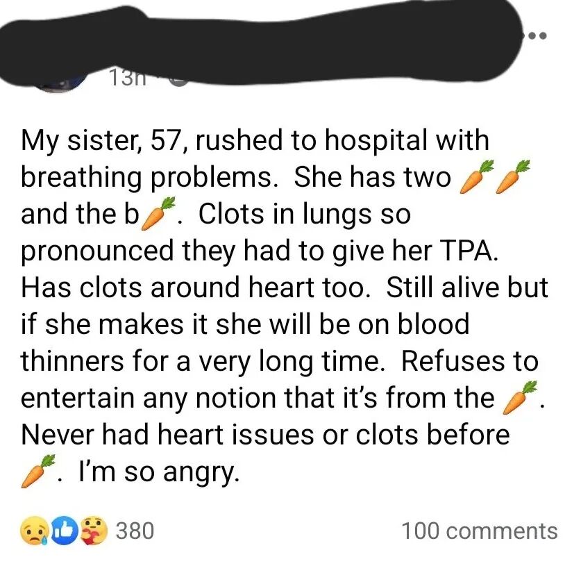 例如,“我57岁的姐姐因呼吸问题被紧急送往医院,她接受了两次和B”,B指增强针,翻译过来便是这个不知道是否真实存在的“姐姐”接受过三针疫苗。