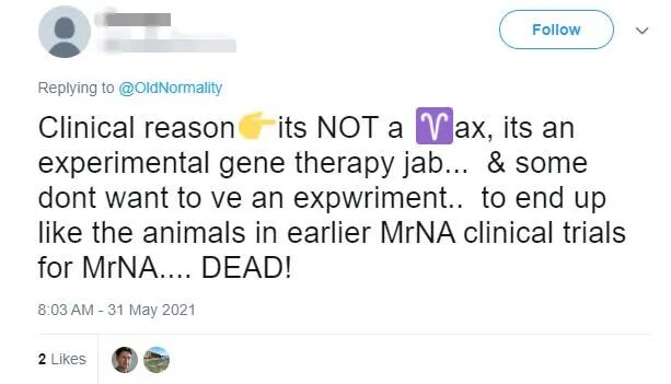 他们会发表反对疫苗的言论,同时散播有人因接种疫苗而患病乃至死亡的案例。当然,他们的观点与案例基本未经或无从查证,直接发到社交媒体上,就会遭到人工智能审核算法的删除、屏蔽、限流,或者打上一则“官方来源称推文有误且存在误导性”的标签。