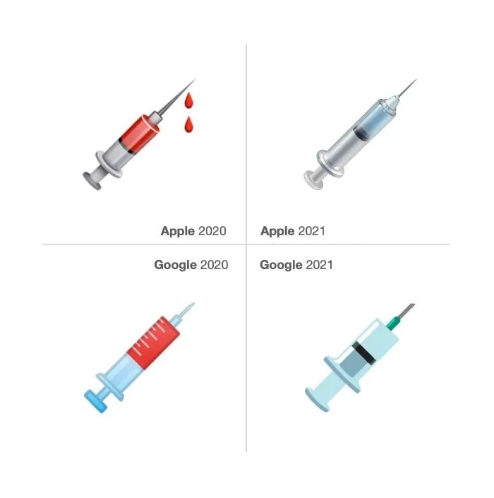 一些提供Emoji表情服务的厂商,决定移除针管里的血液,使其更加通用、更适合描述新冠疫苗或疫苗接种。2021年4月,苹果的iOS 14.5系统首次实装了不带血的表情。此后,从谷歌、三星、微软,再到推特和脸书,都去除了针管中的血液。