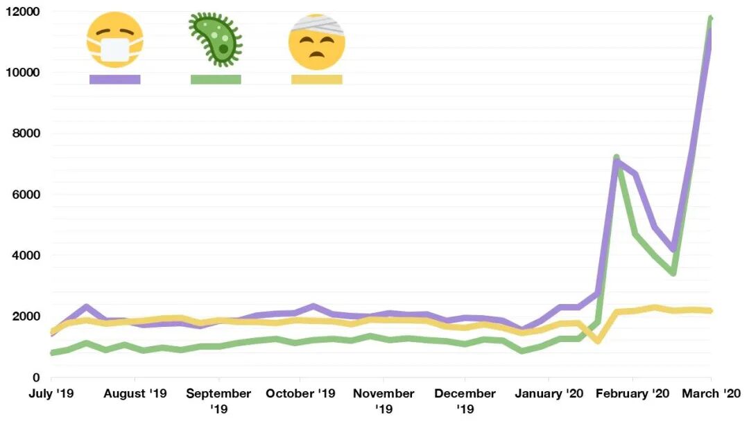 根据Emoji百科网站Emojipedia的多项数据统计,有一部分Emoji的使用率在疫情期间显著上升。