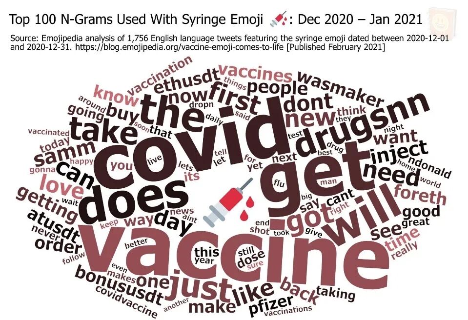 疫情时期,彻底换了一层含义。根据Emojipedia所截取的、2020年12月至2021年1月期间的1756条英语推特,和结合使用的常用词,变成了“COVID-19”“疫苗”,以及“辉瑞”“莫德纳”等欧美疫苗厂商的名字。上文提到的“微生物”、“戴口罩的脸”等符号,也会同一起出现。