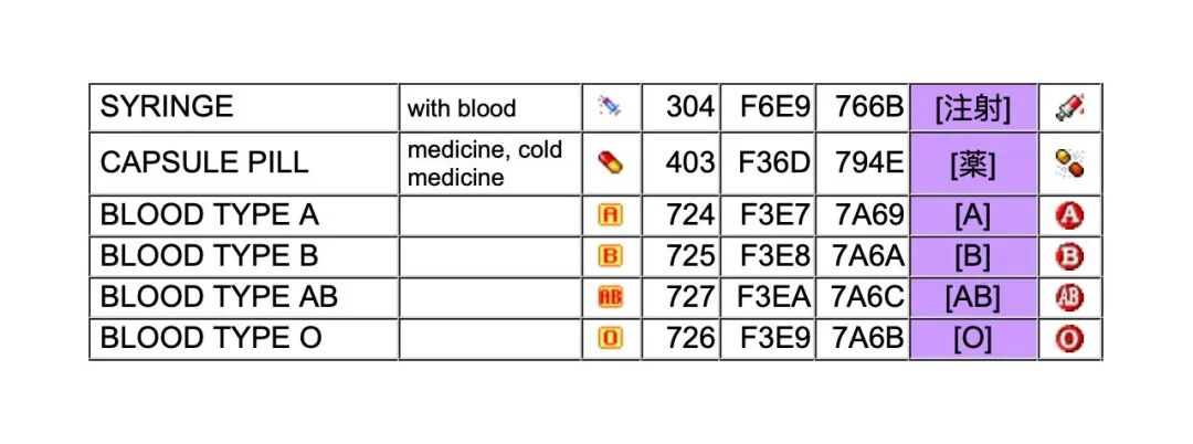 自1999年首次加入表情符号大家庭以来,一直用于形容“注射”或“献血”行为。此后,欧美厂商计划引入类似的表情符号,同时兼顾和日本电信运营商的兼容性。2008年,谷歌的一份提议和日本表情符号兼容的文件,就明确要求得“带点血”(with blood)。