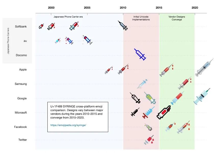 2015年,Emoji表情推出了1.0版本,也包含在内,大部分厂商都为的针管里注入了红色的血液。此时的会和“血液”“静脉”等词语连用,此外还和“纹身”沾点关系。
