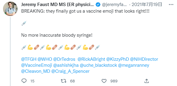 更何况还有一批人,为了让“接种疫苗”的Emoji看起来不再血腥和可怕而努力至今。政府、药企、媒体和广大的医疗工作者,迟早能够在辟谣这件事上少花些银子和口舌。