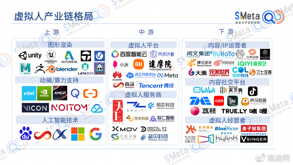 《报告》指出虚拟人产业链中包含:图形渲染、算力、虚拟人平台、内容社交平台,虚拟人经营者等多方面企业,从技术、平台、运营三个角度对虚拟人产业划分,为行业上下游的链接提供帮助。