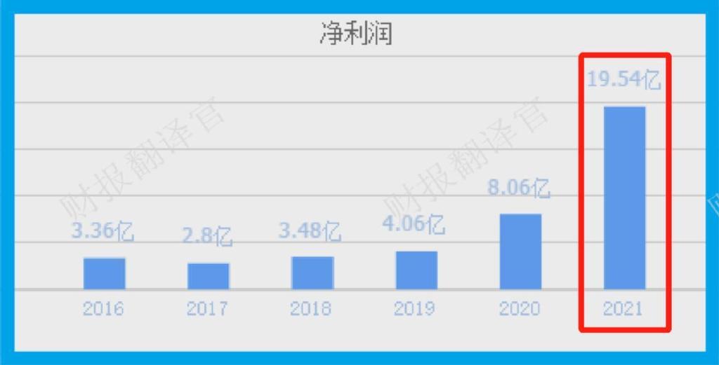 目前,该公司的历史业绩已连续4年实现了大幅度的增长,并在2021年以19.54亿元的净利润创出了历史新高。