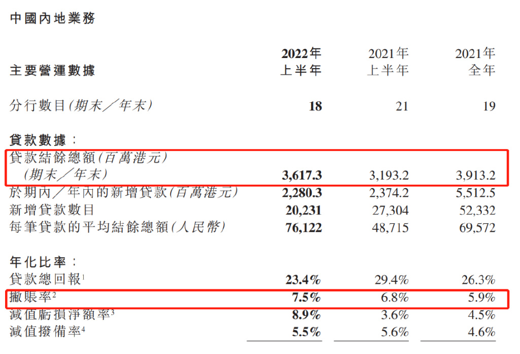 具体到内地业务上,亚联财贷款余额为36.17亿港元,期内新增贷款22.8亿港元,新增贷款笔数20231个,平均贷款结余总额为76122元。同期撇账率高达7.5%,去年同期为6.8%。2021年全年为5.9%。而所谓撇账,是香港在财务上的说法,意思和内地冲销坏账差不多,是在消费者发生严重拖欠时金融机构采取的一种行为,通常认为这些账款难以追回。