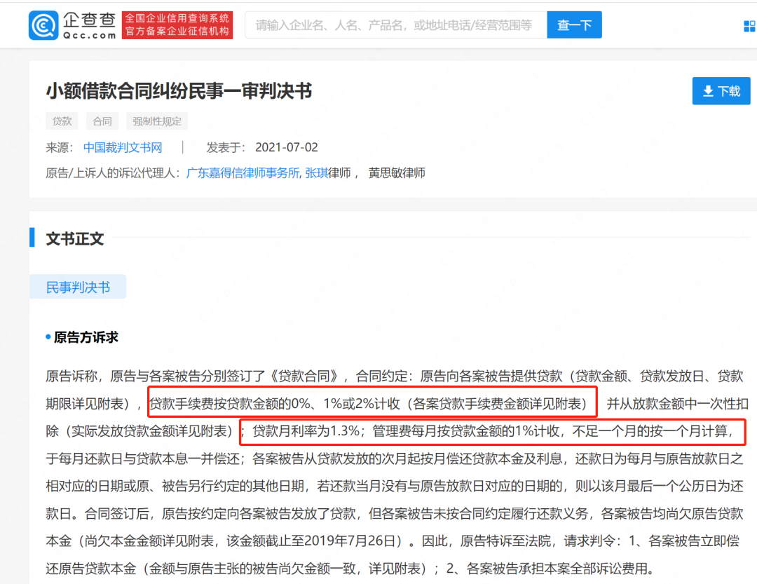 一则小额借款合同纠纷判决书(案号(2020)粤0304民初21940号)显示,原告深圳亚联财小贷与被告签订了《贷款合同》,合同约定了贷款利率和各类费用,即:贷款手续费按贷款金额的0%、1%或2%计收(各案贷款手续费金额详见附表),并从放款金额中一次性扣除(实际发放贷款金额详见附表);贷款月利率为1.3%;管理费每月按贷款金额的1%计收,不足一个月的按一个月计算,于每月还款日与贷款本息一并偿还。相关金额截止到2019年7月26日。