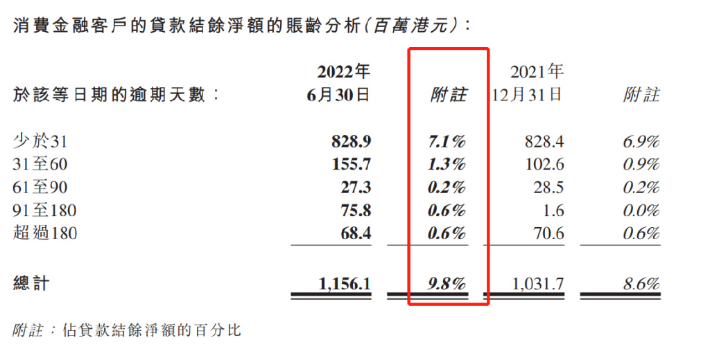 逾期率方面,亚联财30天以内逾期额为8.29亿港元,占贷款结余净额的7.1%,31-60天逾期额为1.55亿港元,占比1.3%;总逾期额为11.56亿港元,比例为9.8%,去年同期为8.6%。