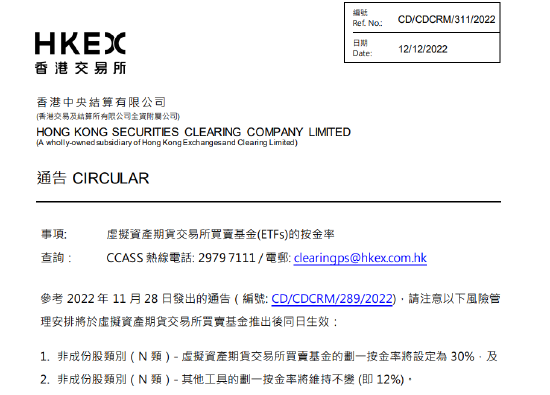 点击返回中国前沿资讯首页 零字节资讯网2022年12月13日消息: 港交所:虚拟资产期货交易所买卖基金的划一按金率将设定为30% 编辑: 中国玉王 零字节资讯网发布 181阅 0评 港交所:虚拟资产期货交易所买卖基金的划一按金率将设定为30%,其他工具的划一按金率将维持不变(即12%)。 炒股开户享福利,入金抽188元红包,100%中奖! 海量资讯、精准解读,尽在新浪财经APP 责任编辑:张海营 赞微海报分享请继续点击阅读以下震撼之作:136幅锁魂 ×21密钥开玄伊甸园真容现世新疆于阗 点击上面零字节资讯网相机的圆圈生成这篇文章的奇异、神秘的海报然后将海报保存图片收藏,可发朋友圈