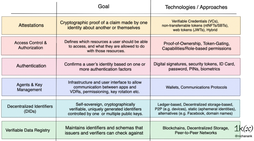 然而,我们在链上的活动和持有的东西对我们是谁给出了一个有限的看法(而且不是保护隐私的)。区块链只是去中心化身份堆栈的一个层次。其他的堆栈也有助于解决一些重要的问题,比如: