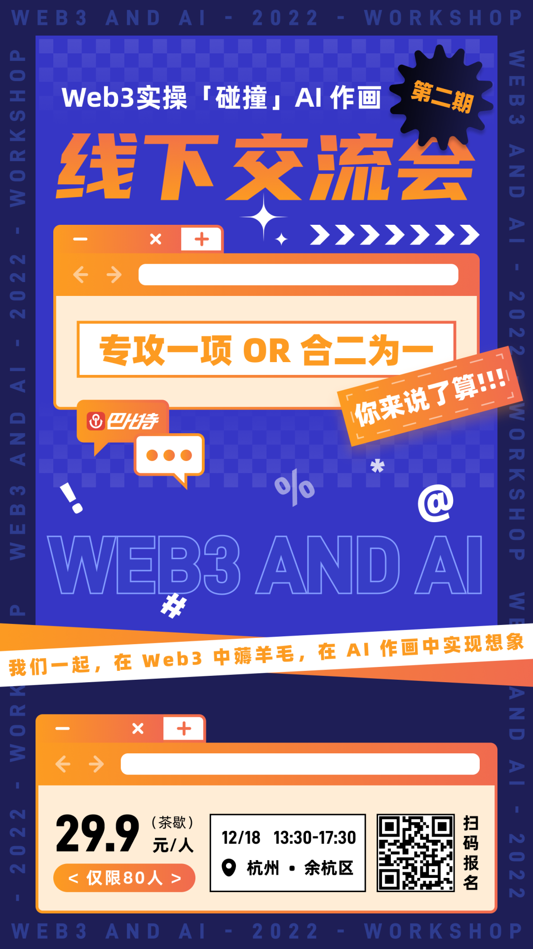 《Web3 实操『碰撞』AI 作画》线下交流会(第二期)来啦!!!12月18日,杭州余杭,邀你一起在Web3中薅羊毛,在AI作画中实现想象。仅限80人,先到先得,详情查看:https://wnv.xet.tech/s/44uISp