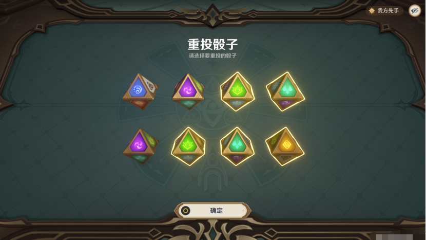 在对局开始时,玩家将会获得一次掷骰的机会。每一枚骰子都是八面骰,骰面上分别有着《原神》的七种元素与万能元素。每一回合开始,玩家都会根据掷骰结果,获得8个元素骰。而角色卡牌想要释放技能,则要消耗对应的元素骰。