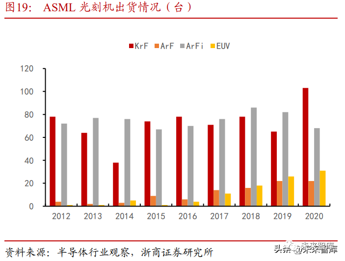 KrF 胶及 ArF 胶(含 ArFi 胶)凭借较高单价占据 80%以上市场份额。TECHCET 数据 显示,2020 年 ArF 和 ArFi(ArF 浸没式光刻胶)市场规模共计 9 亿美元,占据约 48%的全 球半导体光刻胶市场份额,位列第一,KrF 光刻胶市占率 34%,排名第二,G/I 线胶以 16% 的市占率位列第三。