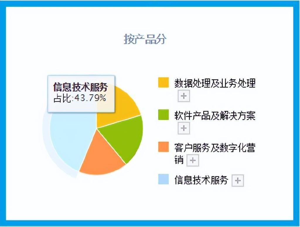 这家企业信息技术服务的收入占比为43.79%,数据处理业务的收入占比为20.37%,软件产品及解决方案的收入占比为18.62%。
