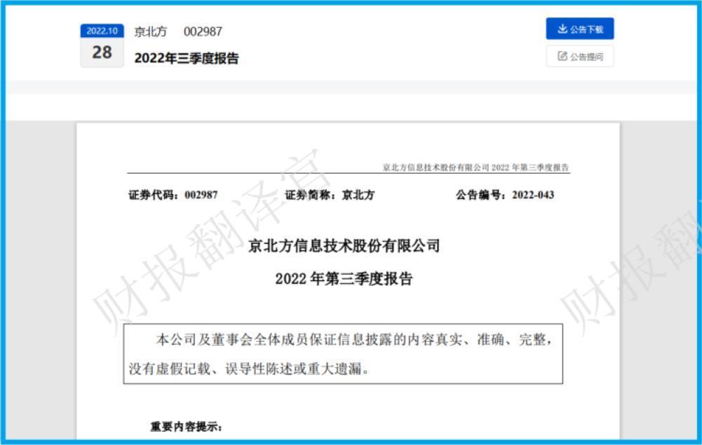 而本文既没有推荐京北方这只股票,也没有说京北方公司有多么的好,而是精炼翻译该企业的财报。