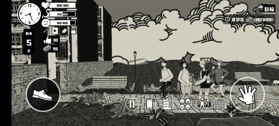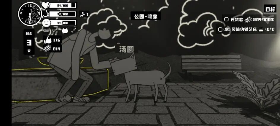 主角心情太差会无心工作,而陷入饥饿则会损伤健康值。解决办法很简单,玩家可跟随心愿单选择价格合适的心仪食物,这样既可提升心情值也能填饱肚子,当然也要小心吃了路边摊会发生腹泻,但一般不管也可自愈;或者选择去后花园撸一只叫“汤圆”的猫,免费又治愈。而放在日常,“双峰面馆”的一碗环保油炒面也能饱腹。人才市场晚上6点关门。如果速度够快,男主可以早中晚共打三份工。到了晚上,找一个日租床铺,再到次日清晨8点,重复打工生涯。