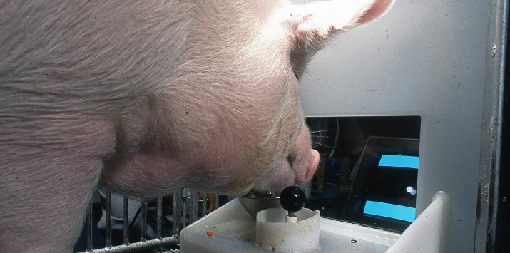 去年《心理学前沿》杂志刊登了一篇英国科学家的研究,在研究中,科学家驯养了四头猪,并成功教会了它们打游戏。游戏非常简单,使用摇杆操纵屏幕上的光标,将其移动到指定位置,结果每只聪明的小猪都以很高的成功率完成了操作。