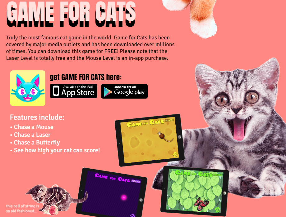 《Game for Cats》由一个名为Hiccup二人团队开发,团队中仅有一位美术和一位程序员。游戏内容没有什么难度,无非是用一些屏幕中活动的物体引导“玩家”去捕捉。不过听起来没什么技术含量的游戏,其实还是需要一些关键窍门的,这也让它成功打动了主子和铲屎官们。