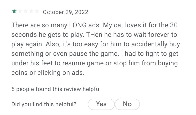 不过,一个有趣又传统的问题摆在了人们面前――游戏内购。《Game for Cats》 下载免费,但后续解锁更多场景需要付费,这时候小猫小狗们就会毫不犹豫的按下“付款”(也可能只是一通乱挠),让收到付款短信的主人无可奈何,而开发团队自然就成为了封口浪尖上的人。