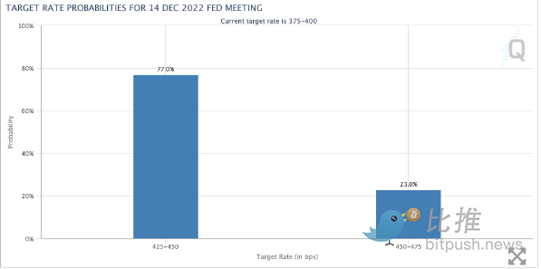 根据 CME Group 的FedWatch数据,在连续四次激进加息75个基点之后,目前市场预计美联储在12月加息50个基点的可能性约为 77%。