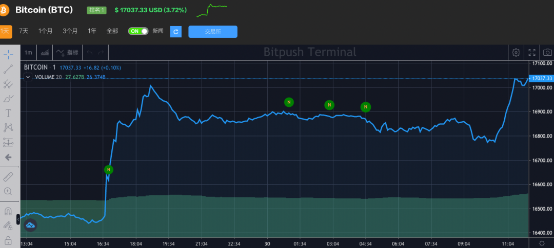 比推终端数据显示,鲍威尔发表讲话后,截至美东时间2:30PM,比特币反弹至 17,019 美元,24小时涨幅3.6%。以太坊的涨幅更大,24 小时内涨幅超过 6%,交易价格为 1,287 美元。传统市场上,对政策敏感的 2 年期美国国债收益率下跌,标准普尔 500 指数扭转跌势走高。
