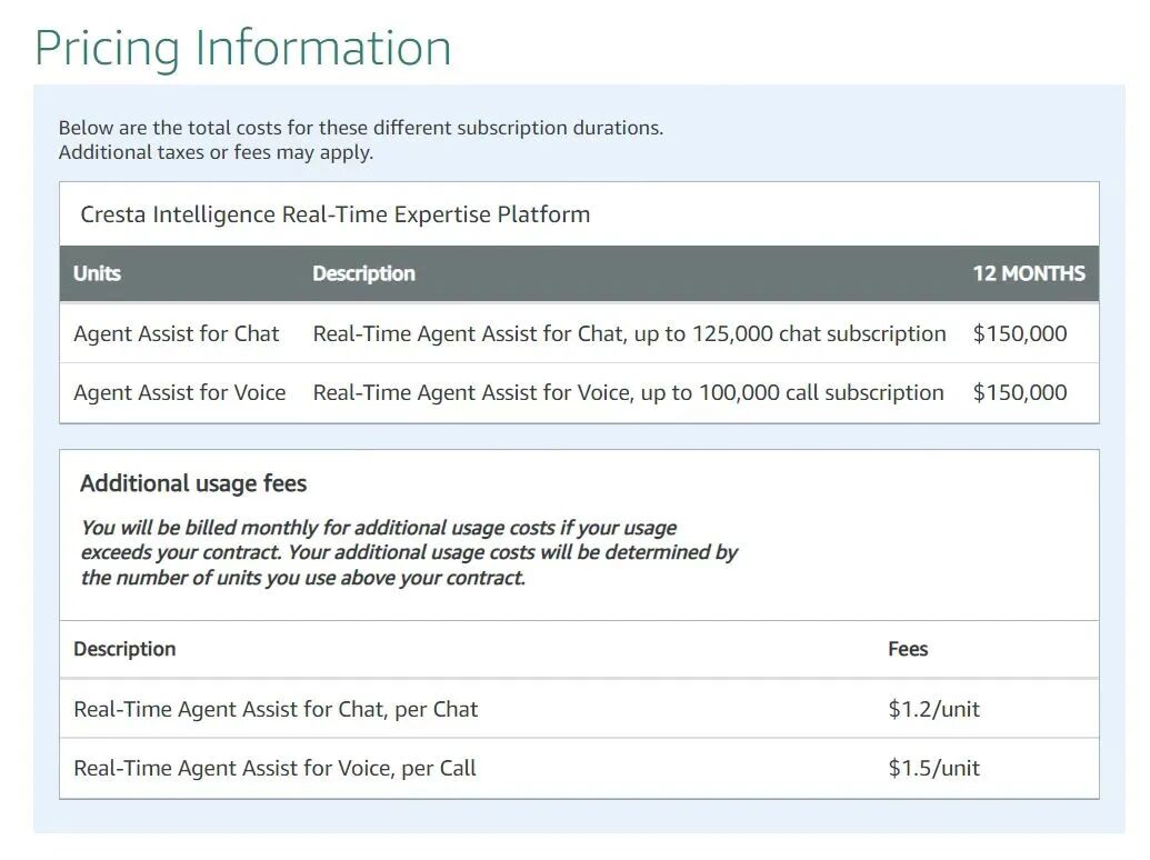 商业模式方面,Cresta 目前采用非公开、定制化的定价模型,并且究竟按照 per seat 的模式还是按照 Consumption-base 的模式进行收费也根据客户需求而定。Cresta 并未公开具体价格,但我们在 AWS 官网找到了 Cresta 的核心产品 Agent Assist 的定价模型,具有一定的参考意义。根据图片所示,Agent Assist 在 AWS 上的定价方式为“年费+根据额外使用量收费”的模式,文本对话每年 15 万美元,包含 12.5 万次的对话服务,超出 12.5 万次的部分按照每次对话 1.2 美元收费。语音通话也是如此,每年 15 万美元,提供 10 万次语音通话实时指导服务,超出 10 万次的部分按照每通电话 1.5 美元收费。
