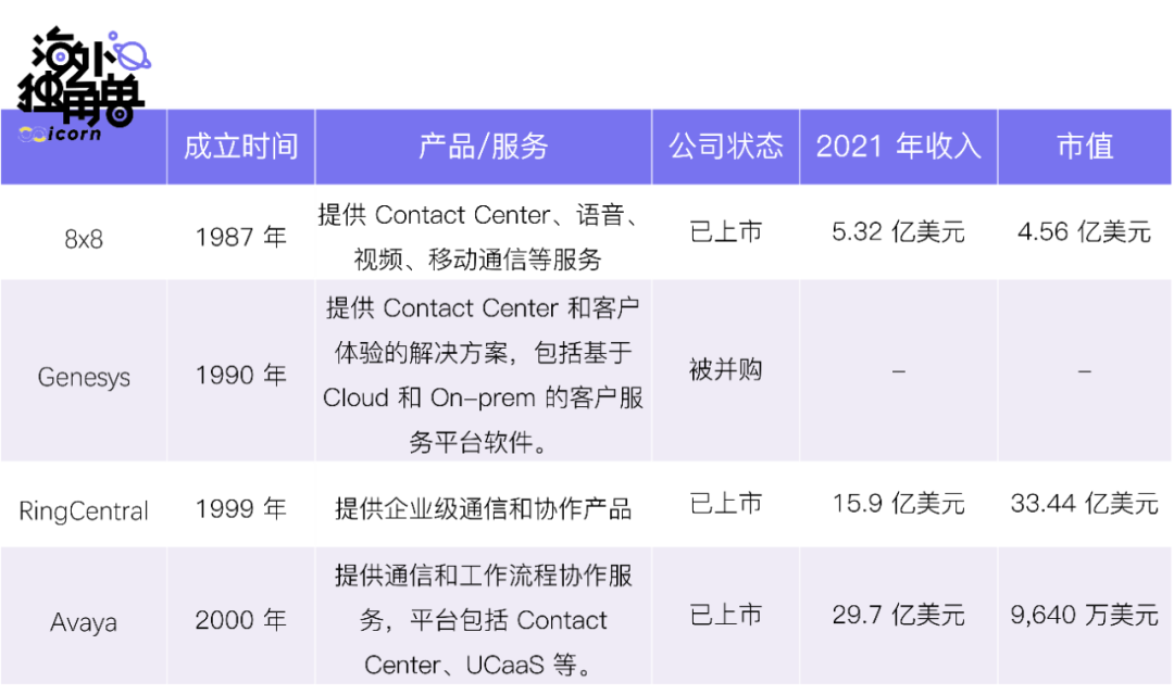 Contact Center 赛道老牌玩家包括 Genesys、Avaya、RingCentral、8×8 等。Microsoft、Amazon 等大型科技企业和 Salesforce、HubSpot 等头部 CRM 企业也在 Contact Center 投入很多研发资源。