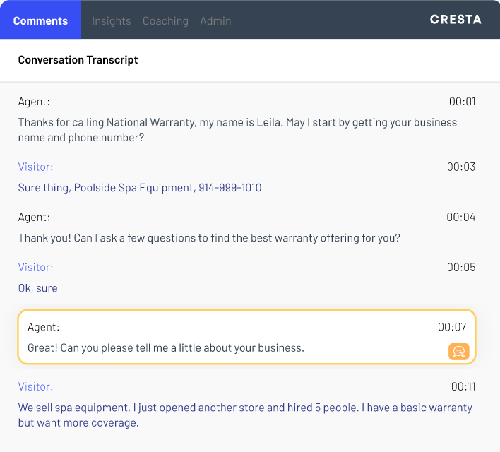 借助 Director 提供的实时在线提醒、评论与反馈、现场协助等功能,管理者可以根据 AI 的反馈,优化团队绩效。这意味着管理者对团队的管理和指导不再受限于空间,即使远程工作也能保持紧密同步的联系。其中的 Cresta Opera 作为一种无代码工具,可以帮助管理者直接对团队进行指导。如下图所示,客服与客户的对话能够实时展示在管理者面前,并且管理者可以在下方对客服的某一具体服务(回复)进行评论和指导。