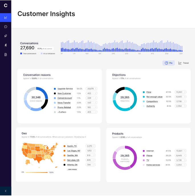 如果说 Agent Assist 是对客户提出的问题进行回答指导,那么 Insights 则是回答了企业自己的问题,例如“我应该更加担心我的竞争对手还是我的现状?”、“新的定价和包装策略表现如何?”等等。