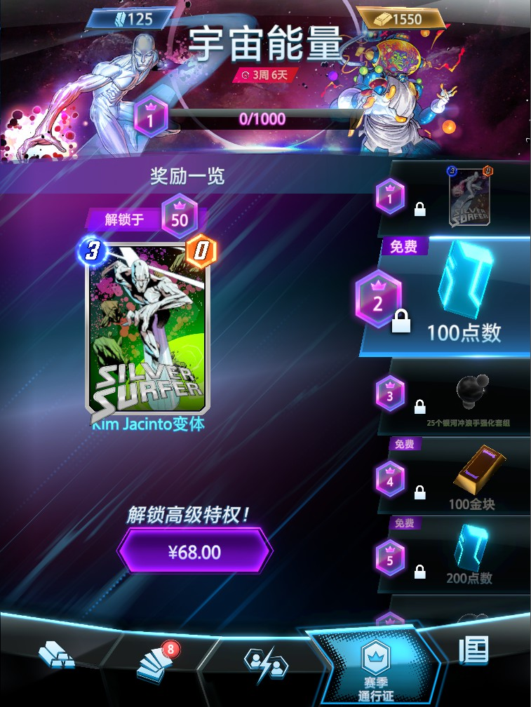 在《Marvel Snap》中,最核心的进度树是名为收藏等级 (Collection Level) 的机制,这是游戏中获得新卡牌的最主要来源。而围绕着提升收藏等级,有三种主要的货币:点数(Credits)、黄金(Gold) 和强化套组(Booster) 。它们的关系是:
