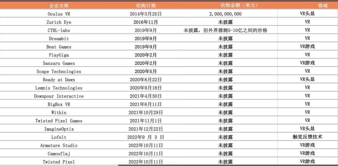 2022年10月,Meta举行了年度 Connect 大会。在会上,Meta除发布新款 VR 头显 Quest Pro 外,还宣布收购 Armature、Camouflaj 与 Twisted Pixel 三家游戏开发商。Meta表示,这三个工作室目前是Meta的VR发行商Oculus Studios的一部分,但并未透露这些工作室未来的动作。Meta 表示,这些工作室将致力于“将雄心勃勃且具有前瞻性的游戏引入VR”。