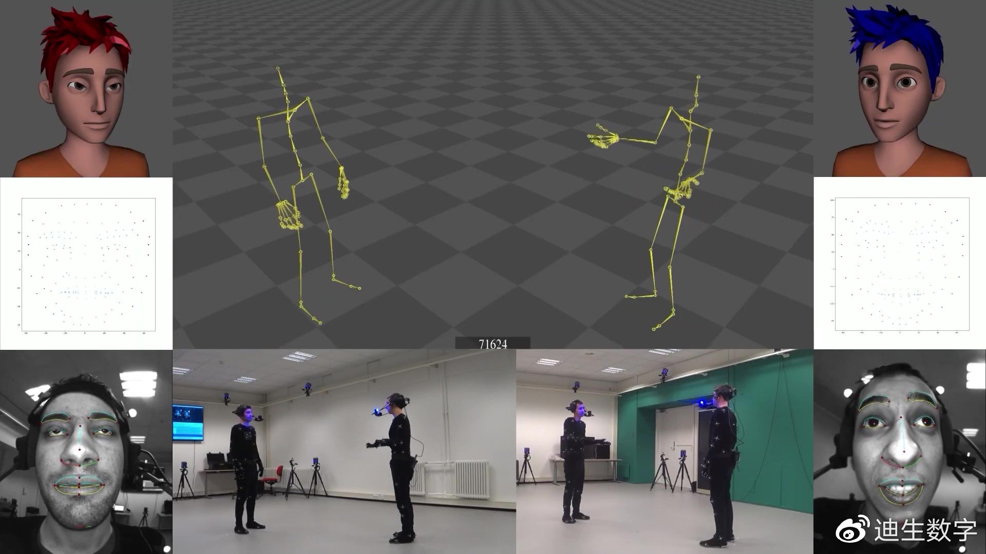 该实验室配备了世界顶尖的Vicon光学动作捕捉系统Dynamixyz面部捕捉系统Vicon Pulsar虚拟现实主动发光追踪器、HP Reverb G2 混响耳机、虚幻游戏引擎,以及Motion Builder和Maya等三维制作软件。 14 台高精度、低延迟的Vantage 动作捕捉相机搭配算力强大的Shogun软件可以在50平米的拍摄区域内对多个对象的非语言行为和其他运动进行实时精准捕捉,这对于在游戏和虚拟现实中与虚拟数字人进行合理的社交互动、为下一代虚拟数字人自动生成实时社交行为至关重要。