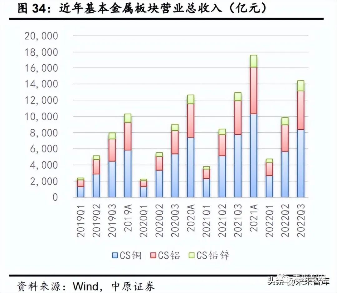 2022 年前三季度铜、铝板块营收与归母净利累计增速呈逐季放缓态势。2022 年前三季度,铜板块累计营收分别为 2674.06 亿元、5691.02 亿元和 8382.52 亿元, 分别同比增长 16.13%、10.91%和 7.98%;归母净利润分别为 41.25 亿元、89.16 亿元和 120.63 亿元,分别同比增长 57.26%、16.64%和-1.87%。铝板块前三季度累计营收分别为 1646.24 亿元、3272.92 亿元和 4760.50 亿元,分别同比 增长 38.64%、23.39%和 14.04%;归母净利润分别为 97.12 亿元、216.51 亿元和 279.72 亿 元,分别同比增长 83.26%、52.12%和 21.76%。铅锌板块前三季度累计营收分别为 413.36 亿元、898.57 亿元和 1262.29 亿元,分别同比 增长 27.91%、29.78%和 15.53%;归母净利润分别为 14.20 亿元、36.37 亿元和 48.35 亿元, 分别同比增长-4.75%、9.63%和-3.39%。