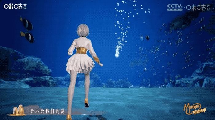 当周深站在宇宙的星球上开始唱歌时,满天星辰起舞,无数流星划过,一条巨大的鲸鱼在星点间游荡而过,魔幻而柔情;王心凌演唱《彩虹的微笑》时,真的可以一跃踩上那道彩虹,随着歌曲的演绎,乘坐云朵上的地铁,来到闪着幽光的静谧城堡。