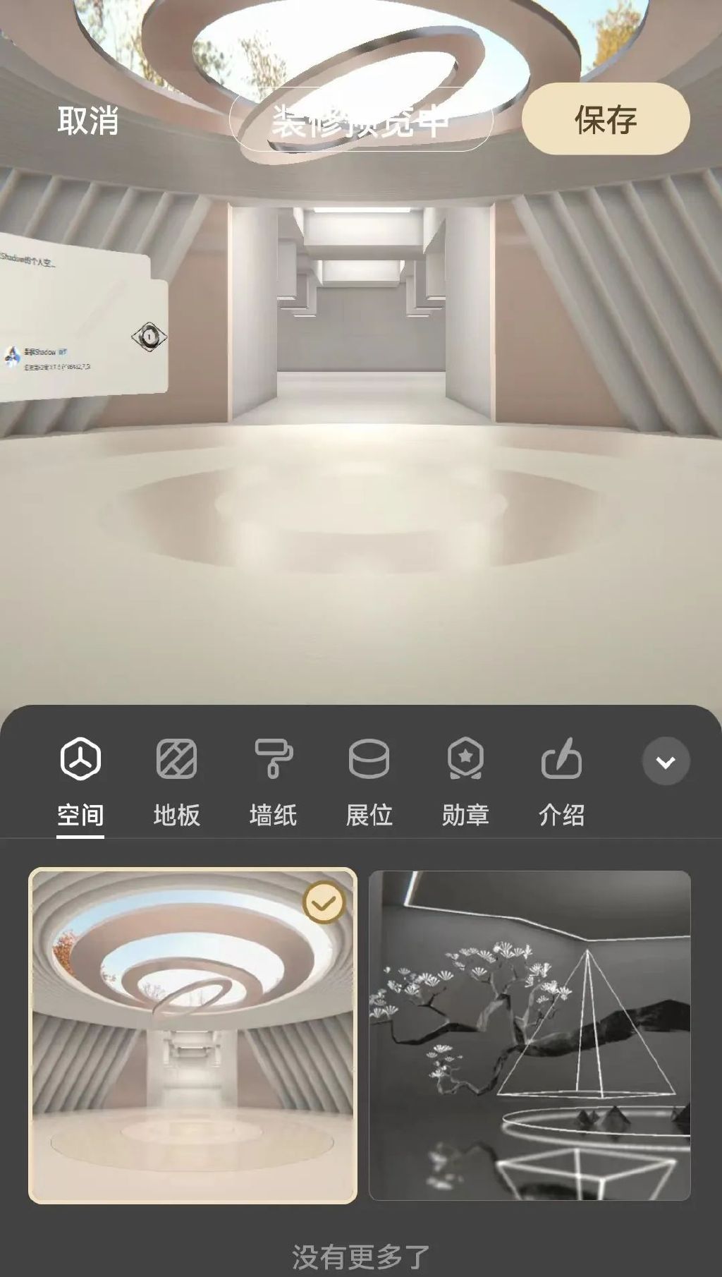 接下来的环节,玩过淘宝人生或者其他虚拟装扮类游戏的小伙伴想必都不陌生,你可以根据自己的喜好,对空间、地板、墙纸、展位、勋章等进行“装修”。