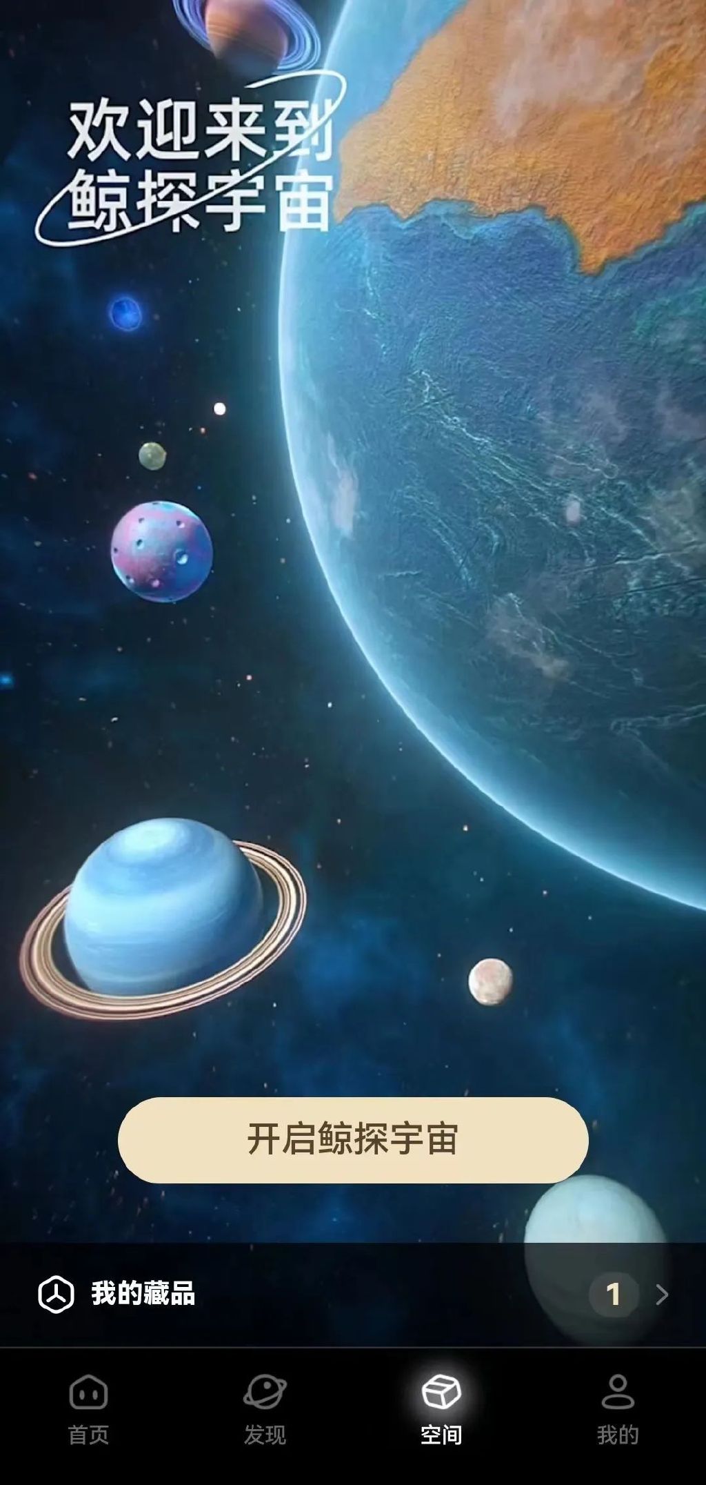 升级后的鲸探APP,「藏品」选项变成了「空间」进入页面并向左滑动可以看到一共7颗虚拟星球。
