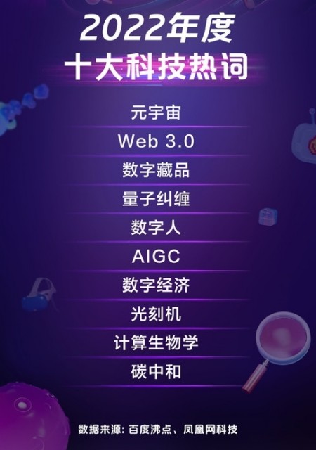 近日,百度沸点联合凤凰网科技发布了“2022年度科技热词”,分别是元宇宙、Web3.0、数字藏品、量子纠缠、数字人、AIGC、数字经济、光刻机、计算生物学、碳中和。