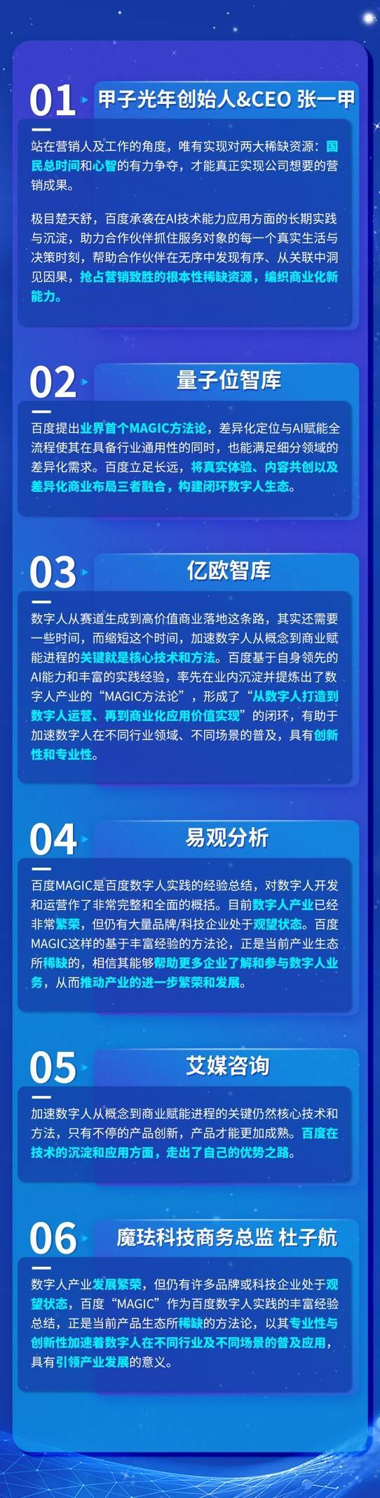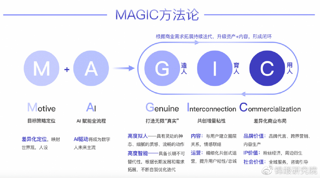 具有行业普遍适应性,助力更多企业实现数字化转型,实现数字人辅助或替代真人工作,百度数字人为虚拟作品创作者打造的这套一套独有的运营心法,简称“MAGIC”方法论(M代表Motive;A即AI;G代表Genuine;I则代表的是Interconnection,而C指的是Commercialization)。通俗来讲,就是打造根据商业需求拓展持续迭代,升级资产和内容,从而形成闭环的独创的打法。目前报告只揭露了一页理论内容,更深的内核还有待公众更进一步的深挖。