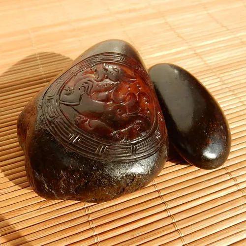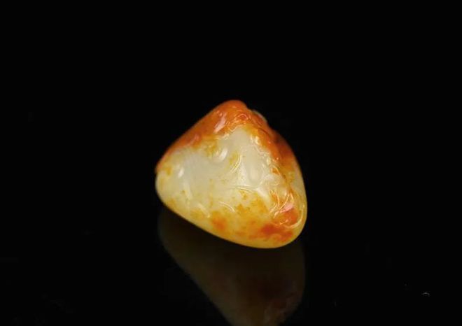 正宗的红皮料,玉色由外至内逐渐变浅,表面呈现自然的扩散,非均匀,但层次分明,过渡美观。艳丽如墨红,夺目犹鸡冠,是红皮的最大特点。偶尔有沉积,红黑相间,色泽弥漫散布,也不影响其美观程度,只要无杂色无瑕疵,就是好料。